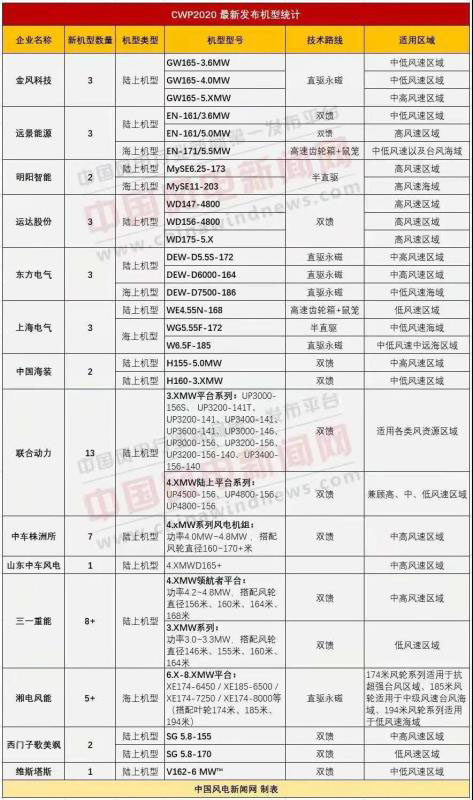 本網獨家統(tǒng)計了21家中國風電整機商名錄及2020年最新發(fā)布產品機型信息(數(shù)據更新至2020.12.5),排名不分先后,部分連續(xù)兩年沒有新增訂單的整機企業(yè)不在本次統(tǒng)計范圍!
