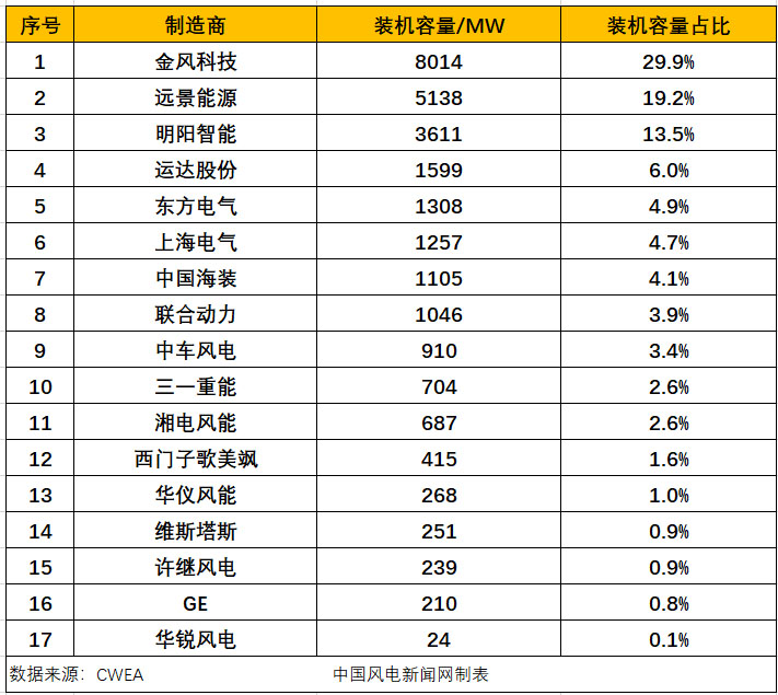 2019年,中國風電有新增裝機的整機制造企業(yè)共17家,新增裝機容量2678.5萬千瓦。