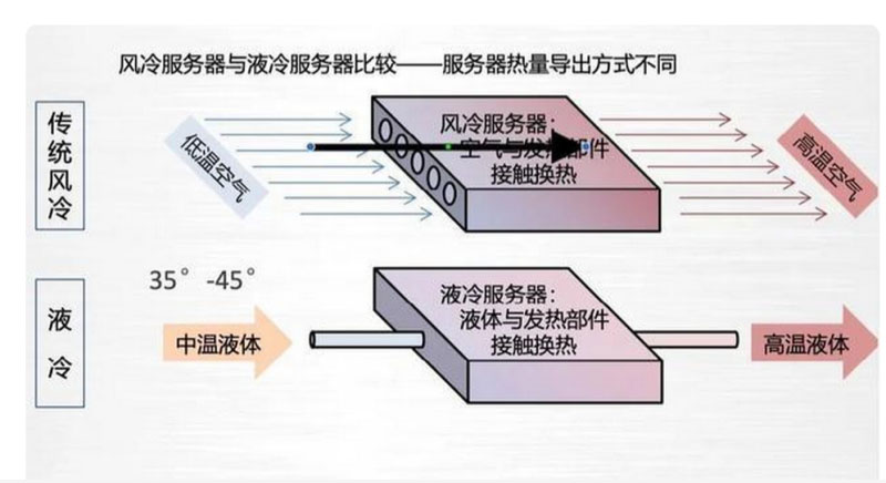 在數(shù)據(jù)中心中,傳統(tǒng)風(fēng)冷一般是通過低溫空氣進(jìn)入到服務(wù)器中,與發(fā)熱部件接觸換熱,再排出高溫空氣;而液冷則是通過中溫液體與發(fā)熱部件接觸化熱,排出高溫液體?!吨袊豪鋽?shù)據(jù)中心發(fā)展白皮書》介紹,液冷技術(shù)不受海拔、地域的影響,可以保持較高的散熱效果、降低能耗,還能提升數(shù)據(jù)中心運(yùn)算效率、空間利用率和能源利用率等。