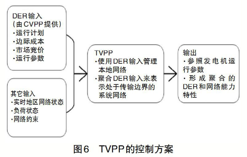 技術(shù)型虛擬電廠。如圖6所示,DER投資組合方案的實(shí)時運(yùn)行信息通過在該地區(qū)運(yùn)行的各種CVPP傳遞給TVPP后,TVPP會將把這些信息與本地的網(wǎng)絡(luò)信息(如拓?fù)?、配網(wǎng)約束、網(wǎng)絡(luò)實(shí)時狀態(tài)等)結(jié)合起來,從而最終建立描述與上級輸電網(wǎng)連接的本地配電網(wǎng)區(qū)域內(nèi)各DER運(yùn)行特性的配置文件。這一文件可以用來為DSO和TSO提供一系列的系統(tǒng)運(yùn)行服務(wù),如實(shí)時平衡,頻率和電壓支持,電網(wǎng)阻塞管理等。通過這種方式,TVPP就可以從本地配網(wǎng)區(qū)域內(nèi)的各類DER聚合后的靈活運(yùn)行中獲益,為輸電網(wǎng)中的其他電源提供輔助服務(wù)。