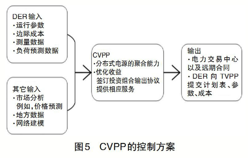 商業(yè)型虛擬電廠。如圖5所示,在CVPP的實(shí)際運(yùn)行中,每個DER主體都需要首先上報(bào)其運(yùn)行參數(shù)、邊際成本等信息,一般可由CVPP安裝在這些DER處的終端裝置完成信息采集,這些DER的輸入信息同市場分析、地方數(shù)據(jù)等其他輸入信息一起匯集到單一的虛擬電廠中創(chuàng)建配置文件,每個文件都代表了一個DER實(shí)時組合的運(yùn)行描述。隨著CVPP獲取的市場交易信息不斷增加,CVPP將逐步完成在遠(yuǎn)期合同市場、期貨市場、電能量市場及輔助服務(wù)市場的投資組合方案的優(yōu)選并實(shí)時評估各類DER聚合后參與相關(guān)交易的能力,最后CVPP將向電力交易中心提交相關(guān)的訂單合同和相應(yīng)的投標(biāo)報(bào)價的信息,而CVPP組合方案中的各DER則需要向TVPP提交發(fā)電計(jì)劃、運(yùn)行成本等參數(shù)信息以供完成后續(xù)調(diào)整。