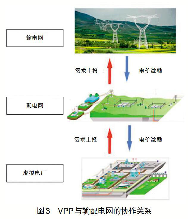 前面已經(jīng)提到,虛擬電廠可以將區(qū)域內(nèi)的各類分布式能源聚合后接入電網(wǎng),在這一載體下,個體DER可以獲得能源市場的準(zhǔn)入并從VPP得到相關(guān)市場的實(shí)時信息。另一方面,VPP使其所屬的各類DER對系統(tǒng)運(yùn)營商可見,向電網(wǎng)提供了一種可用于電力網(wǎng)絡(luò)主動控制與響應(yīng)的聚合資源,在市場運(yùn)行中與輸電網(wǎng)與配電網(wǎng)一起實(shí)現(xiàn)分層的需求上報(bào)與價格激勵信息交互,如圖3所示。