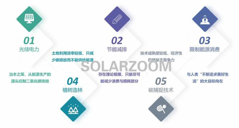 在SOLARZOOM新能源智庫看來,2060碳中和的最終實現(xiàn)方法不僅僅是風(fēng)光儲和植樹造林,還包括節(jié)能減排、限制能源消費、碳捕捉技術(shù)。但在實現(xiàn)2060碳中和的5大方法中,確實是風(fēng)光儲和植樹造林的效果最好。這與習(xí)總書記的講話內(nèi)容高度一致。