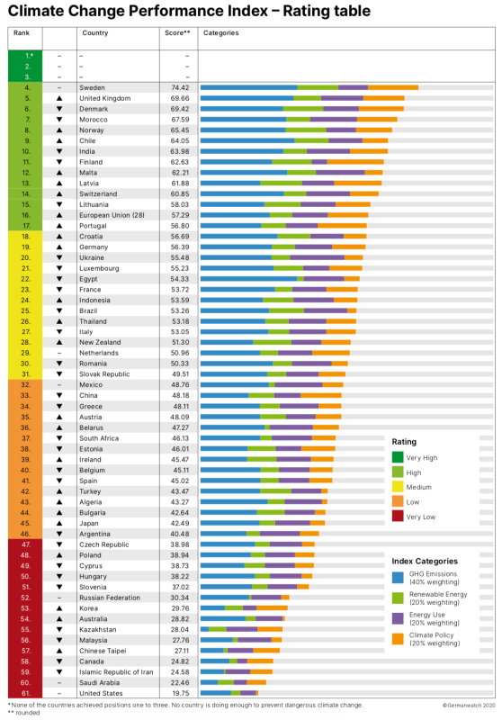 在上述榜單中,美國(guó)排在最后一位,主要是因?yàn)闅夂蛘邍?yán)重滯后;而中國(guó)排在第33位,4項(xiàng)指標(biāo)得分分別為:溫室氣體排放16.47、可再生能源8.68分、能源效率9.06、氣候政策13.96分。