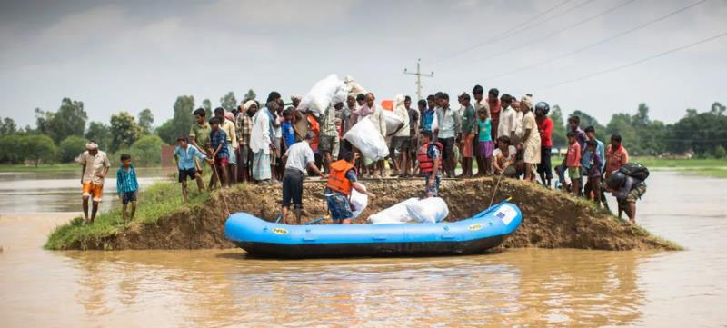 ©? 聯(lián)合國兒童基金會/Samir Jung Thapa 食物和飲用水通過木筏運(yùn)送到尼泊爾班克縣的一個村莊,當(dāng)時該村的道路因暴雨而被切斷。