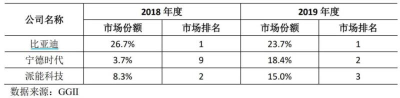 根據(jù)GGII的統(tǒng)計(jì),2018年和2019年,公司與國內(nèi)主要競爭對手的出貨量排名及市場份額情況如下表所示: