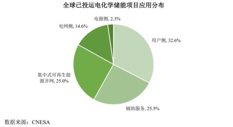 根據(jù)CNESA的統(tǒng)計(jì)數(shù)據(jù),截至2018年底,全球電力系統(tǒng)新增投運(yùn)電化學(xué)儲能項(xiàng)目裝機(jī)規(guī)模約3.7GW,累計(jì)達(dá)到6.6GW。從應(yīng)用分布看,用戶側(cè)領(lǐng)域的累計(jì)裝機(jī)規(guī)模最大,占比32.6%;輔助服務(wù)、集中式可再生能源并網(wǎng)、電網(wǎng)側(cè)和電源側(cè)分列二至五位,所占比重分別為25.5%、25.0%、14.6%和2.3%(如下圖所示)。
