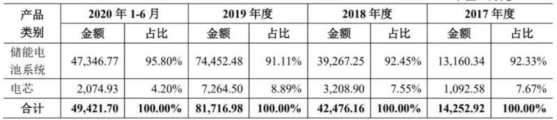 上海派能主營業(yè)務(wù)突出,收入全部來源于儲能電池系統(tǒng)和電芯,其中儲能電池系統(tǒng)收入多年來占比均超過90%,具體如下表所示: