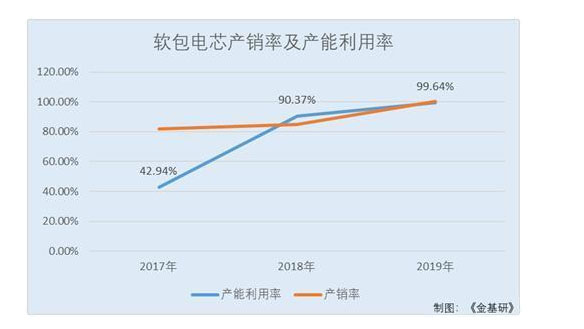同期,派能科技的軟包電芯產(chǎn)銷(xiāo)率分別為81.63%、84.77%、100.43%。