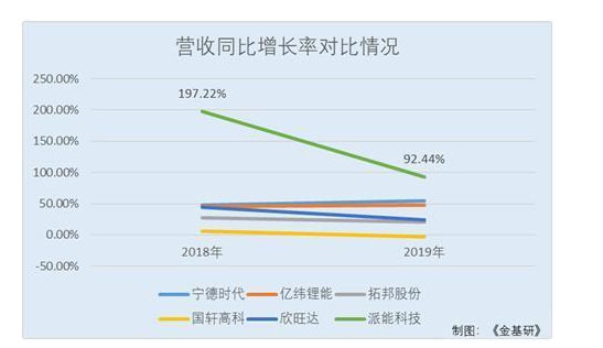 2018-2019年,同行業(yè)可比上市公司寧德時(shí)代新能源科技股份有限公司(以下簡(jiǎn)稱(chēng)“寧德時(shí)代”),的營(yíng)業(yè)收入分別同比增長(zhǎng)48.08%和54.63%;惠州億緯鋰能股份有限公司(以下簡(jiǎn)稱(chēng)“億緯鋰能”)的營(yíng)業(yè)收入分別同比增長(zhǎng)45.9%和47.35%;深圳拓邦股份有限公司(以下簡(jiǎn)稱(chēng)“拓邦股份”)的營(yíng)業(yè)收入分別同比增長(zhǎng)26.99%和20.32%;國(guó)軒高科股份有限公司(以下簡(jiǎn)稱(chēng)“國(guó)軒高科”)的營(yíng)業(yè)收入分別同比增長(zhǎng)5.97%和-3.28%;欣旺達(dá)電子股份有限公司(以下簡(jiǎn)稱(chēng)“欣旺達(dá)”)的營(yíng)業(yè)收入分別同比增長(zhǎng)44.81%和24.1%。