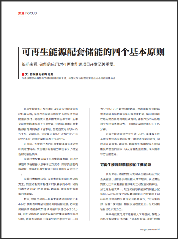 可再生能源發(fā)電在電力系統(tǒng)中的占比會(huì)持續(xù)增加,儲(chǔ)能系統(tǒng)的配置可以有效解決棄風(fēng)棄光及可再生能源并網(wǎng)帶來的電力系統(tǒng)穩(wěn)定性和靈活性問題。目前儲(chǔ)能成本較高、收益模式尚不完善,可再生能源配套儲(chǔ)能尚處于初期探索階段。儲(chǔ)能系統(tǒng)在可再生能源發(fā)電中的應(yīng)用首先是解決波動(dòng)性問題,未來成本下降后可進(jìn)一步解決可再生能源發(fā)電的間歇性問題??稍偕茉磁涮變?chǔ)能的發(fā)展過程中,建議遵循上述四個(gè)基本原則,以避免盲目性和資源浪費(fèi),促進(jìn)儲(chǔ)能產(chǎn)業(yè)的健康發(fā)展。