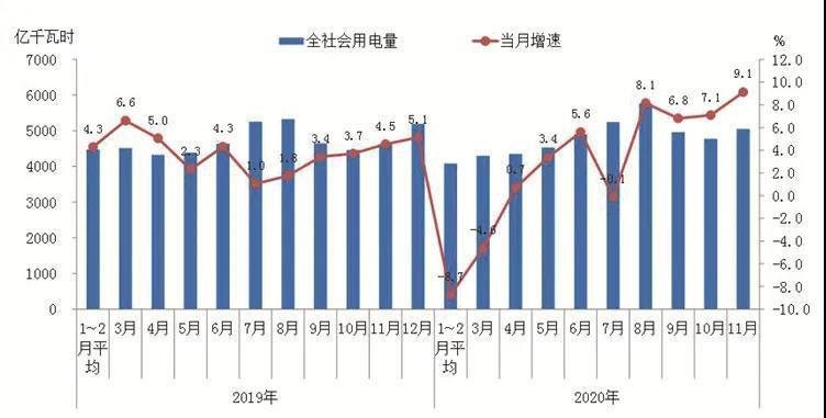 11月份,國家電網(wǎng)經(jīng)營區(qū)全社會用電量5050億千瓦時,同比增長9.1%,增速創(chuàng)近27個月新高,較去年同期上升4.6個百分點。