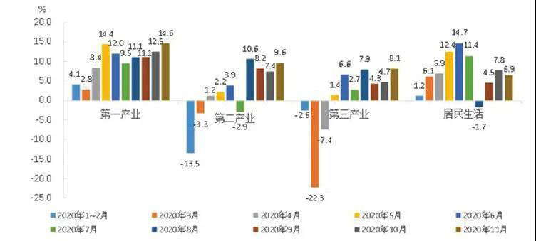 11月份,第一、二、三產(chǎn)業(yè)和居民生活用電量增速分別為14.6%、9.6%、8.1%、6.9%。其中,第一產(chǎn)業(yè)用電量連續(xù)4個月保持兩位數(shù)增長,增速創(chuàng)年內(nèi)新高;第二產(chǎn)業(yè)用電量增速連續(xù)4個月保持高位,對全社會用電量增長貢獻率達到76.0%、連續(xù)4個月超過70%;第三產(chǎn)業(yè)用電量增速創(chuàng)年內(nèi)新高,累計增速由負轉(zhuǎn)正;居民生活用電量保持較快增長。