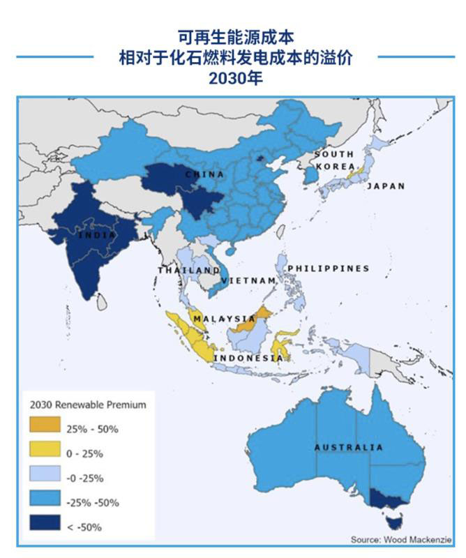 目前,在亞太區(qū)域中,僅有印度和澳大利亞市場的可再生能源發(fā)電成本低于新建煤電廠。這一局面將于2030年出現(xiàn)重大轉(zhuǎn)變,屆時,幾乎所有亞太市場可實現(xiàn)可再生能源發(fā)電成本低于煤電。無補貼時代的可再生能源高速增長期已經(jīng)到來。