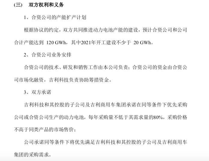 2018年12月,浙江吉潤(rùn)與寧德時(shí)代簽署合資經(jīng)營(yíng)合同,雙方共同出資設(shè)立合資公司。該合資公司注冊(cè)資本為10億元,浙江吉潤(rùn)出資金額為4.9億元,出資比例為49%。不過(guò),浙江吉潤(rùn)與寧德時(shí)代的協(xié)議,僅僅說(shuō)了會(huì)一起生產(chǎn)電池。