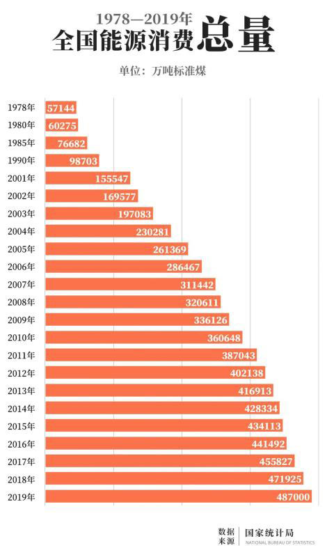↑改革開(kāi)放以來(lái),我國(guó)歷年能源消費(fèi)總量↑