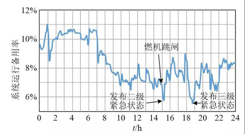 引發(fā)CAISO實(shí)施輪流停電的直接原因是系統(tǒng)供需不平衡,運(yùn)行備用容量不滿足相關(guān)要求。CAISO對(duì)系統(tǒng)運(yùn)行備用容量的要求遵循NERC標(biāo)準(zhǔn)BAL-002-3和WECC標(biāo)準(zhǔn)BAL-002-WECC-2a,最小的備用容量大約是負(fù)荷的6%。用于維持該要求的運(yùn)行備用主要包括機(jī)組旋轉(zhuǎn)備用,以及可在10min內(nèi)啟動(dòng)的機(jī)組和可切負(fù)荷等非旋轉(zhuǎn)備用。圖2給出了8月14日加州電力系統(tǒng)運(yùn)行備用曲線。