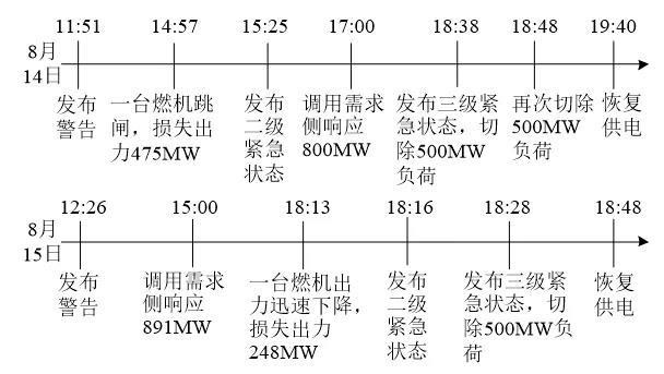 8月14日下午14:57,一臺(tái)燃?xì)鈾C(jī)組因故障跳閘,損失出力為475MW。下午15:25,CAISO預(yù)測(cè)未來幾個(gè)小時(shí)將出現(xiàn)電力短缺,難以維持規(guī)定的備用容量要求,宣布進(jìn)入二級(jí)緊急狀態(tài)。下午17:00,CAISO調(diào)用約800MW需求側(cè)響應(yīng)資源以維持電力供需平衡。下午18:38,隨著傍晚光伏出力下降,系統(tǒng)無法滿足負(fù)荷需求和備用容量要求,CAISO宣布進(jìn)入三級(jí)緊急狀態(tài),切除500MW負(fù)荷。10min后,再次切除500MW負(fù)荷。下午19:40,發(fā)電側(cè)資源可滿足負(fù)荷需求和備用要求,CAISO命令恢復(fù)所有的負(fù)荷。