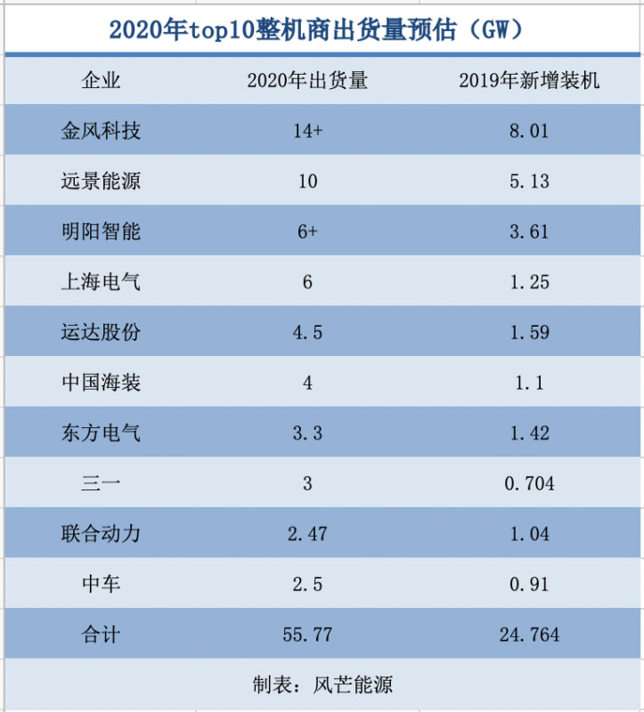 根據(jù)風(fēng)芒能源問詢、統(tǒng)計(jì)以及預(yù)估,2020年全年,排名前十的整機(jī)商出貨量將超過50GW左右。相較于光伏行業(yè)動(dòng)態(tài)變化的集中趨勢(shì),風(fēng)電整機(jī)商的排名及市占率基本保持穩(wěn)定。其中,TOP3的整機(jī)商金風(fēng)科技、遠(yuǎn)景能源、明陽智能累計(jì)出貨量超過30GW,三家市場(chǎng)占比最終預(yù)計(jì)在60%左右,與2019年的62.6%比,雖受搶裝影響,三家市占率稍有減弱,但行業(yè)集中度基本未受影響。