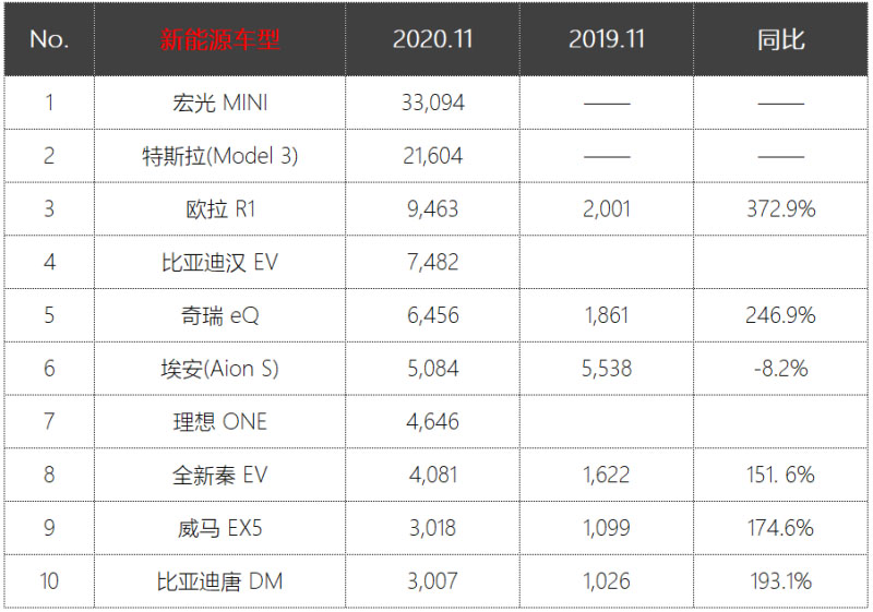 今年雖然受疫情影響,但得益于全行業(yè)的迅速恢復(fù),尤其私人消費市場對新能源汽車認(rèn)可度的提升,小型電動車銷量乘勢火爆。在前11個月新能源乘用車排名前五的車型中,除了特斯拉以12.19萬的銷量位居絕對第一外,上汽通用五菱和長城歐拉分別以8.08萬輛、4.17萬輛分列第三位和第五位,甚至超過北汽新能源、蔚來汽車、奇瑞新能源、小鵬汽車等(僅限銷量),升級成行業(yè)內(nèi)現(xiàn)象級事件。
