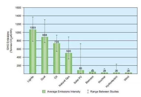 ——褐煤發(fā)電的排放強度中值為1054克/千瓦時(最低790克/千瓦時,最高1372克/千瓦時);