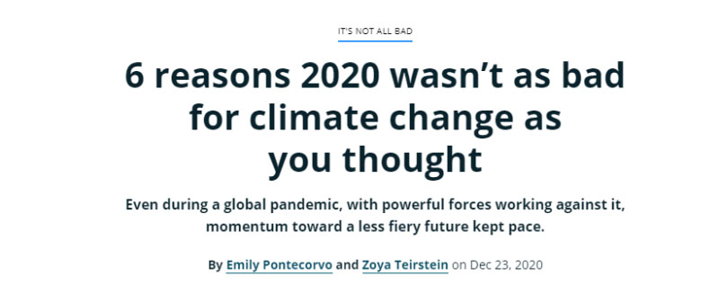 據(jù)Grist.org網(wǎng)站發(fā)表文章,題目是:6 reasons 2020 wasn’t as bad for climate change as you thought (“6個原因:2020年對氣候變化的影響不像你想象的那么糟糕”,作者Emily Pontecorvo and Zoya Teirstein)