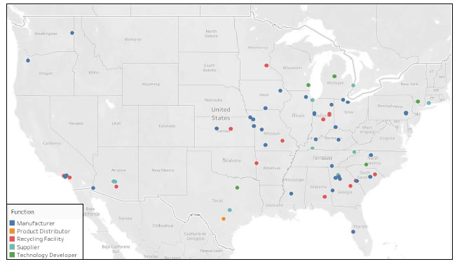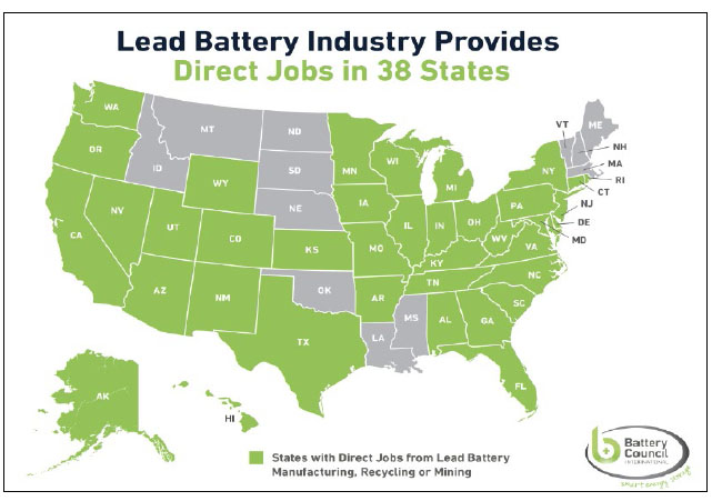 在美國,鉛酸電池行業(yè)的年產(chǎn)值為263億美元。它們在美國國內(nèi)生產(chǎn),并且99%被回收。鉛酸電池在美國18個州生產(chǎn)。此外,美國有10個州有電池回收設(shè)施,有9個州擁有技術(shù)開發(fā)設(shè)施,還有10個州的公司為鉛酸工業(yè)提供原材料(例如石墨)或設(shè)備。鉛酸電池行業(yè)已經(jīng)在美國38個州創(chuàng)造了近25,000個工作崗位(制造。回收、運輸、分配和采礦)。圖27和28分別顯示了美國電池制造設(shè)施分布和創(chuàng)造的就業(yè)機會。