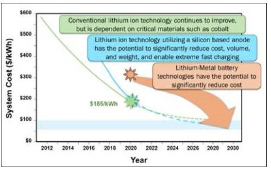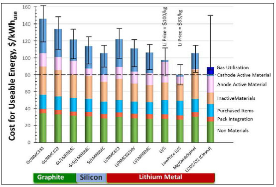 圖18提供了xEV鋰離子電池的成本和技術(shù)發(fā)展趨勢。圖19概述了候選電池技術(shù)及其滿足美國能源部(DOE)成本目標的可能能力。由于不同電池技術(shù)的差異很大,電池研究還包括多個活動的重點是解決整個電池供應鏈中的高成本領(lǐng)域。
