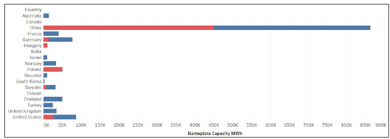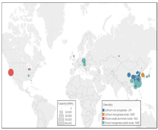 圖16. 計劃建設(shè)(藍色)或在建(紅色)的鋰離子電池制造工廠生產(chǎn)能力