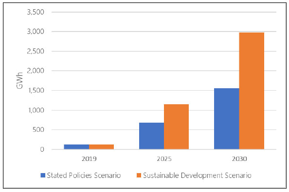 圖14. 根據(jù)國際能源署(IEA)STEPS情景下,在xEV行業(yè)中預計的全球年度鋰離子電池部署量