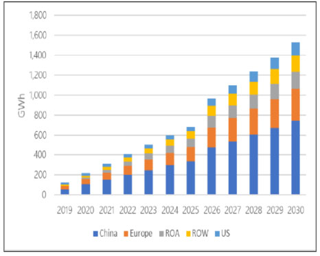 圖11. Avicenne公司對鋰離子電池在全球各地市場的部署預測