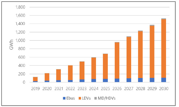 圖12.根據(jù)國際能源署(IEA)STEPS情景下預計的全球鋰離子電池部署量(按車輛類別:電動客車、輕型車輛、中型和重型車輛)