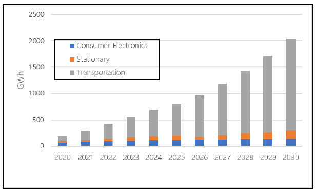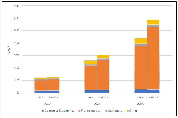 彭博社新能源財經(jīng)公司(BNEF)和Avicenne公司預測了2030年全球所有市場的鋰離子電池部署情況,分別如圖10和11所示。彭博社新能源財經(jīng)公司預測,鋰離子電池在全球消費類電子產(chǎn)品、固定儲能市場和運輸領(lǐng)域的應用將超過2TWh。Avicenne公司的預測涵蓋了以下兩種情況的市場以及其他市場(例如醫(yī)療設(shè)備和電動工具),而兩項研究中,都認為交通運輸行業(yè)將采用90%以上的鋰離子電池。彭博社新能源財經(jīng)公司(BNEF)預計到2030年運輸行業(yè)采用的鋰離子電池容量將達到1.8TWh,而Avicenne公司預計到2030年運輸行業(yè)采用的鋰離子電池容量將達到0.7~1.0TWh。