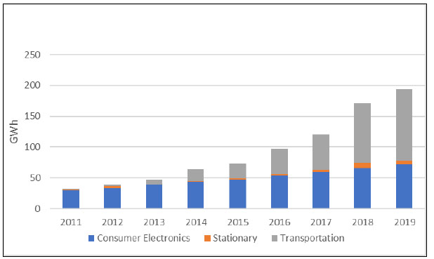 鋰離子電池市場是增長最快的可充電電池市場。從2013年至2018年,鋰離子電池在所有市場的全球銷售額增長了一倍以上。交通運輸行業(yè)在鋰離子電池市場上占主導地位,也是增長最快的行業(yè),各種汽車采用了60%的鋰離子電池。根據(jù)Avicenne公司發(fā)布的調(diào)查報告,全球鋰離子電池市場規(guī)模在2018年為400億美元,如圖9所示,這相當于在全球部署172GWh的電池儲能系統(tǒng),到2019年增至195GWh。