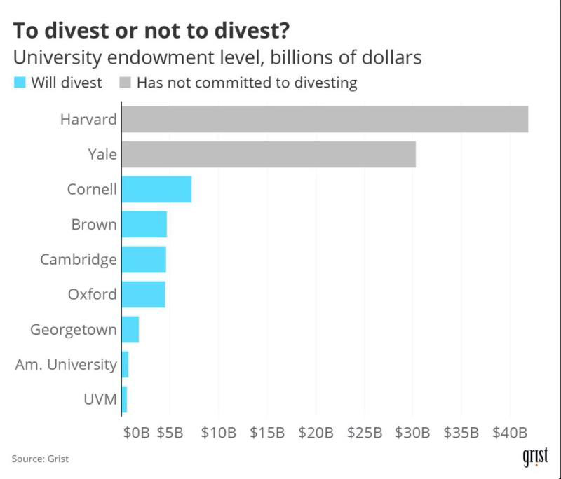 著名的學(xué)校如英國(guó)的牛津、劍橋大學(xué),美國(guó)的喬治敦、布朗、康奈爾大學(xué),加入了越來(lái)越多的大學(xué)計(jì)劃與向他們捐款的化石燃料公司剝離。美國(guó)最富有的兩所大學(xué),哈佛大學(xué)和耶魯大學(xué)的壓力越來(lái)越大,這兩所大學(xué)的捐贈(zèng)總額達(dá)到720億美元。盡管這兩所學(xué)校都沒(méi)有承諾撤資,但哈佛大學(xué)宣布了一項(xiàng)仍然模糊的計(jì)劃,即到2050年將來(lái)自化石燃料公司的捐贈(zèng)額降至零,并聲稱它將能夠與化石燃料公司合作實(shí)現(xiàn)這一目標(biāo)。