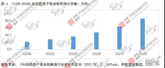 隨著下游新能源汽車動(dòng)力電池需求增長(zhǎng)、新興消費(fèi)領(lǐng)域快速擴(kuò)張以及“十四五”期間儲(chǔ)能產(chǎn)業(yè)爆發(fā),鋰電需求旺盛,帶動(dòng)我國(guó)電解液出貨量在未來保持高速增長(zhǎng)。預(yù)計(jì)到 2025年,我國(guó)電解液總體出貨量可達(dá)到 86.5 萬噸,年均增長(zhǎng)速度約為31.7%,我國(guó)電解液總體市場(chǎng)規(guī)模將達(dá)到 197.8 億元,年均增長(zhǎng)速度約為18.6%。