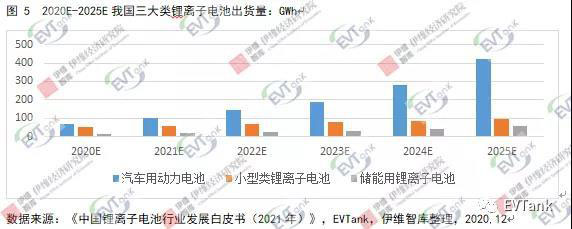 在汽車用動(dòng)力電池領(lǐng)域,隨著新能源汽車滲透率逐步提升,預(yù)計(jì)到2025年,我國(guó)動(dòng)力電池出貨量可達(dá)422.28GWh;在小型類鋰離子電池領(lǐng)域,可穿戴設(shè)備、無人機(jī)、小動(dòng)力等新興消費(fèi)領(lǐng)域?qū)?dòng)小型類鋰離子電池出貨量增長(zhǎng),預(yù)計(jì)到2025年,我國(guó)小型類鋰離子電池出貨量為96.0GWh;在儲(chǔ)能用鋰離子電池領(lǐng)域,隨著電力體制改革推進(jìn)、儲(chǔ)能成本降低以及鋰電替代鉛酸進(jìn)程加速,預(yù)計(jì)到2025年,我國(guó)儲(chǔ)能電池出貨量可達(dá)60.0GWh。