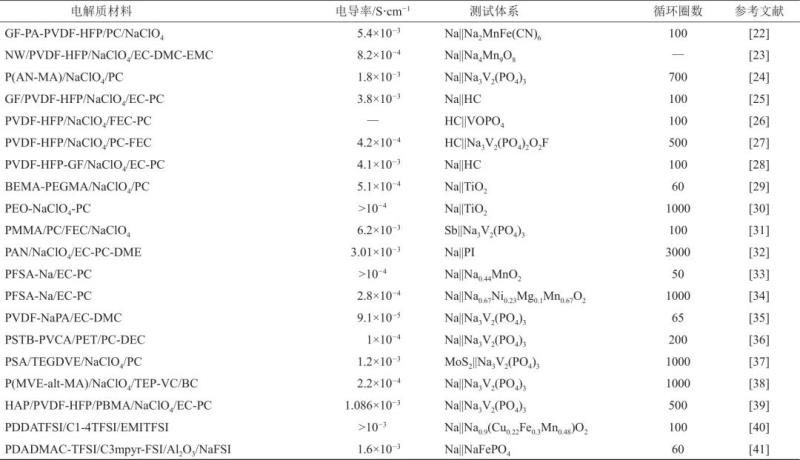 表2對比了凝膠電解質(zhì)的離子電導(dǎo)率及其在不同體系的鈉離子電池中的循環(huán)圈數(shù)??梢钥闯瞿z電解質(zhì)體系的離子電導(dǎo)率多數(shù)在10-3~10-4 S/cm數(shù)量級,與電解液/商業(yè)隔膜體系相當(dāng),體現(xiàn)出室溫鈉離子電池應(yīng)用潛力。需要注意的是聚合物凝膠電解質(zhì)依賴基底與溶劑的分子間力達(dá)到束縛有機(jī)溶劑的目的,然而該作用力較弱,有機(jī)溶劑仍有揮發(fā)可能,導(dǎo)致材料的結(jié)構(gòu)不穩(wěn)定。同時不同聚合物骨架、溶劑分子與電極間的界面演變更為復(fù)雜,SEI膜的結(jié)構(gòu)對性能的影響缺乏深入的表征與系統(tǒng)的認(rèn)識,亟需進(jìn)一步研究。