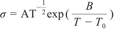 向聚合物固態(tài)電解質(zhì)中引入溶劑分子為離子提供強(qiáng)的分子極化作用,形成聚合物凝膠電解質(zhì),有效地提高了其離子電導(dǎo)率。Hashmi等使用離子液體EMITf浸潤含有0.5 mol/L NaCF3SO3(NaTf)的聚(偏二氟乙烯-co-六氟丙烯)(PVDF-HFP)制備凝膠電解質(zhì),發(fā)現(xiàn)室溫電導(dǎo)率高達(dá)5.74×10-3 S/cm?;谑?2)所描述的玻璃化溫度附近的Vogel-Tammann-Fulcher模型研究了聚合物的自由體積對帶電離子輸運的動力學(xué)過程影響。采用了基于交流-直流技術(shù)的Evans方法[9],通過式(3)