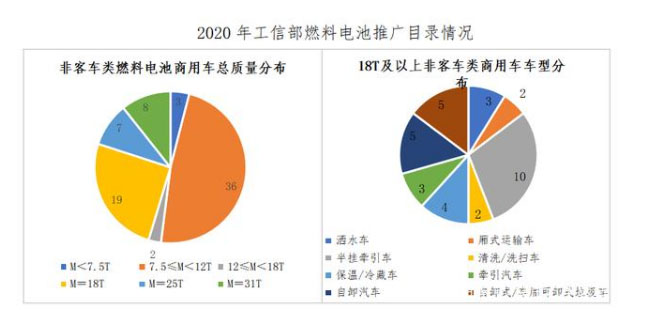 從工信上榜目錄來(lái)看:2020年工信部目錄上榜的281款燃料電池汽車(chē),非客車(chē)類(lèi)商用車(chē)上榜75款,占比26.7%,總質(zhì)量12T及以上36款,占非客車(chē)類(lèi)商用車(chē)48%。其中,18T及以上就有34款,牽引車(chē)類(lèi)13款(牽引車(chē)總質(zhì)量不包括拖掛車(chē)質(zhì)量,例如寶鋼的重卡總質(zhì)量18T,整備質(zhì)量8.8T,準(zhǔn)拖掛車(chē)總質(zhì)量為33.07T,既為42T半掛氫能重卡),非客車(chē)類(lèi)重型商用車(chē)數(shù)量、種類(lèi)和噸位都明顯上升。