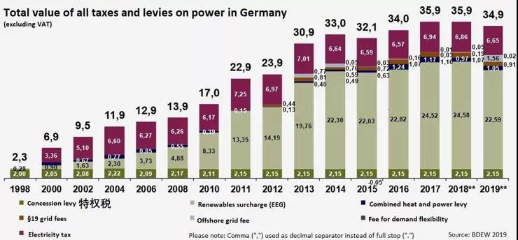雖然德國(guó)的可再生能源發(fā)電發(fā)展迅速,但這也是有代價(jià)的。政府通過(guò)補(bǔ)貼使廉價(jià)的可再生能源在電力市場(chǎng)中優(yōu)先競(jìng)價(jià)出清,從而壓低了現(xiàn)貨市場(chǎng)的電價(jià)。對(duì)于部分在批發(fā)市場(chǎng)中直接購(gòu)電的高能耗大型工廠來(lái)說(shuō),這減少了他們的電費(fèi)支出,使其受益。然而,對(duì)于無(wú)法以批發(fā)價(jià)在現(xiàn)貨市場(chǎng)購(gòu)電的家庭或小型企業(yè)來(lái)說(shuō),大量可再生能源實(shí)際上推高了他們的電價(jià)。這是因?yàn)檎畬?shí)際上是通過(guò)在終端居民賬單中加征可再生能源稅,網(wǎng)絡(luò)費(fèi)用等來(lái)向風(fēng)電場(chǎng)和光伏電站提供資金補(bǔ)貼,這些費(fèi)用甚至能占到總電價(jià)的三分之二。下圖說(shuō)明了近20年來(lái)德國(guó)電價(jià)和各種稅收的增長(zhǎng)。