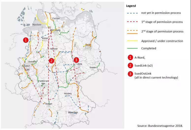 對(duì)此,德國(guó)政府和電網(wǎng)運(yùn)營(yíng)商已經(jīng)開始加快建設(shè)更多的南北輸電線,見上圖。根據(jù)聯(lián)邦網(wǎng)絡(luò)局的數(shù)據(jù),2025年之前,預(yù)計(jì)將有4650公里的新電線建成,另有約3050公里的電力線被翻新。雖然鋪設(shè)新線路涉及到土地,居民等方方面面的協(xié)調(diào)管理,但若不加快輸電線的建設(shè)以減少南北能源消費(fèi)和生產(chǎn)的不平衡情況,這一問題可能會(huì)成為德國(guó)當(dāng)前目標(biāo)達(dá)成的向100%可再生能源發(fā)電的最大阻礙因素。