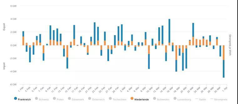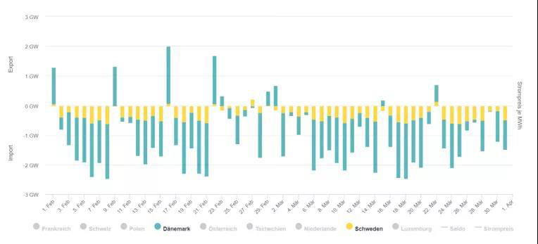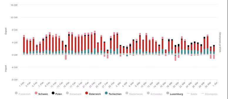 德國(guó)與周邊國(guó)家電力潮流交換圖