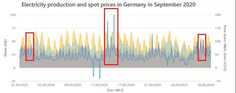 圖中的藍(lán)色曲線代表每日的電價(jià)(右y軸),黃色和綠色色塊分別代表光伏、風(fēng)電出力,淺棕色色塊則是化石能源與核能(以下統(tǒng)稱常規(guī)能源)的發(fā)電量??梢钥闯?,九月雖然風(fēng)電出力較小,但光照資源較為優(yōu)越,因此電價(jià)曲線在一天內(nèi)有非常明顯的峰谷差,最高位和最低位現(xiàn)貨市場(chǎng)出清價(jià)格平均相差約20~30歐元/MWh–正午光電出力最高時(shí)電價(jià)非常低,早晚風(fēng)光發(fā)電都較弱時(shí)電價(jià)又會(huì)暴漲。燃煤、燃?xì)鈾C(jī)組的出力曲線因此與電價(jià)曲線的形狀十分相似,且能看出電價(jià)曲線一般會(huì)略先于基礎(chǔ)能源發(fā)電曲線,說(shuō)明現(xiàn)貨市場(chǎng)的價(jià)格變化有效激勵(lì)了這些常規(guī)電源的靈活出力和調(diào)峰。9月12~13日的周末,由于整體負(fù)荷較低,光伏出力又比較高,現(xiàn)貨市場(chǎng)甚至還出現(xiàn)了負(fù)電價(jià)。這是可再生能源大發(fā)情況下常出現(xiàn)的一種現(xiàn)象,意味著當(dāng)常規(guī)電源壓至最低出力仍不能消納所有可再生能源發(fā)電后,電力公司會(huì)向用戶支付一定的費(fèi)用讓他們開啟家中的電力設(shè)備以消耗多余的發(fā)電,以避免導(dǎo)致電網(wǎng)阻塞和重載超載現(xiàn)象發(fā)生。