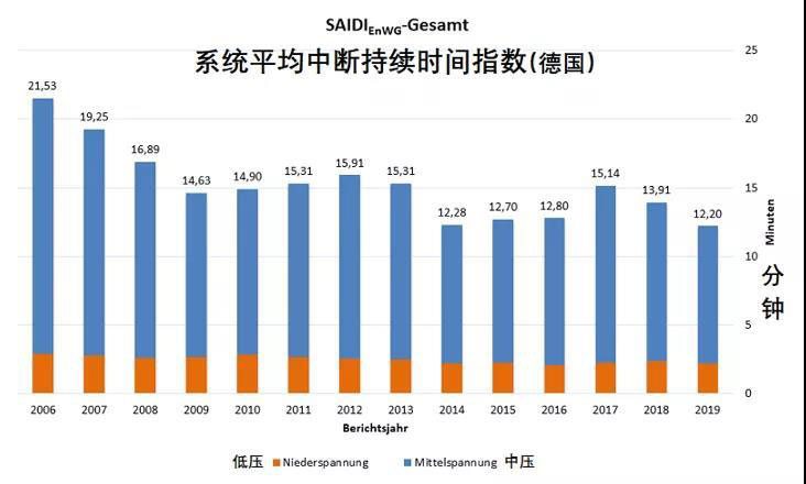 盡管較低的年均停電時(shí)間已經(jīng)驗(yàn)證了德國(guó)電網(wǎng)的相對(duì)穩(wěn)定和可靠性,聯(lián)邦網(wǎng)絡(luò)局仍稱目前德國(guó)的停電現(xiàn)象更多是由極端天氣引起的,認(rèn)為間歇性的可再生能源的過(guò)渡對(duì)電力供應(yīng)質(zhì)量并沒有較大的負(fù)面影響,供電可靠性與綜合電壓合格率持續(xù)處于高位。該機(jī)構(gòu)的一個(gè)新聞稿中稱,自2006年開始對(duì)電力系統(tǒng)進(jìn)行監(jiān)控以來(lái),德國(guó)年度可再生能源電力生產(chǎn)量占總電力負(fù)荷的份額從11.8%上升至2019年的42.4%,2019年風(fēng)光出力最高時(shí)候的發(fā)電占比高達(dá)83.6%,但平均停電時(shí)間仍呈逐年減少趨勢(shì)。2017年雖中斷時(shí)間有所提高,但主要是因?yàn)轱Z風(fēng),洪水和降雪等極端天氣事件所導(dǎo)致。