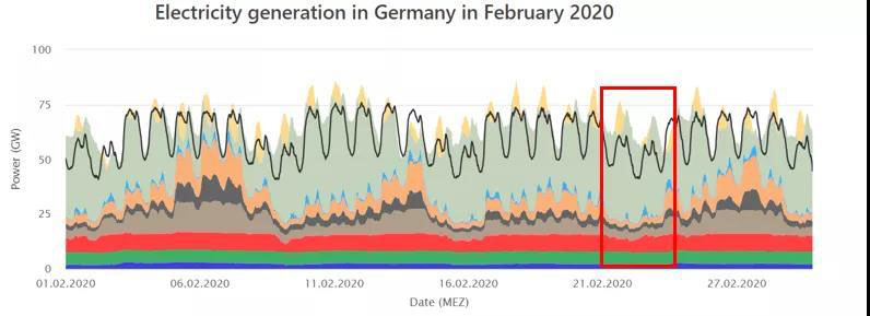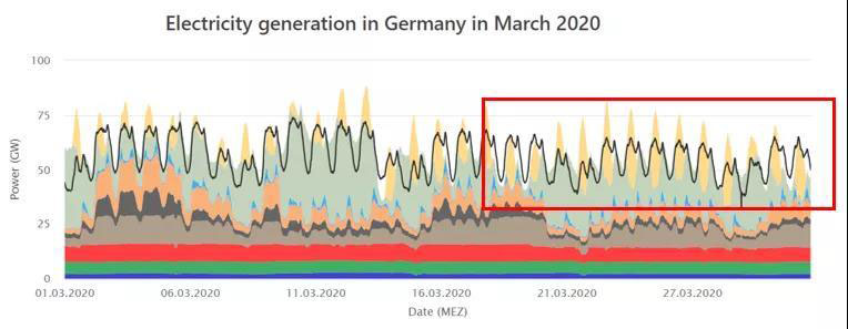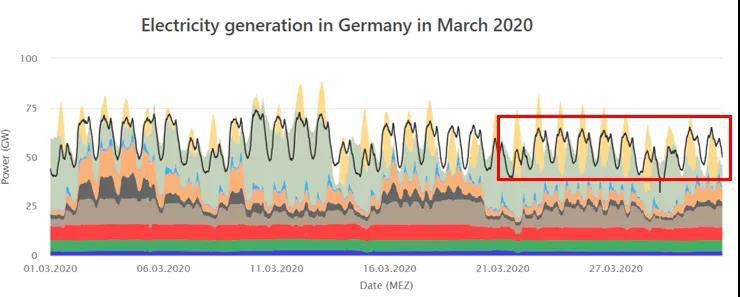 德國(guó)能源和水行業(yè)協(xié)會(huì)(BDEW)和巴登-符騰堡州太陽(yáng)能與氫能研究中心都對(duì)德國(guó)第一季度的可再生能源發(fā)電占比進(jìn)行了測(cè)算,均認(rèn)同二、三月天晴風(fēng)大的氣候因素和疫情導(dǎo)致的用電需求下降使得可再生能源發(fā)電占比快速增加。根據(jù)BDEW的測(cè)算結(jié)果,德國(guó)在2020年第一季度的總用電量(與2019年同期)下降2%,而總發(fā)電量卻同比下降了近7%。這其中核能和化石燃料發(fā)電減少了15%,風(fēng)力發(fā)電量卻激增20%。綜合這些因素,使得可再生能源達(dá)到總發(fā)電量的52%。我們可以通過(guò)比較2019年和2020年2,3月的負(fù)荷曲線看出這點(diǎn)。