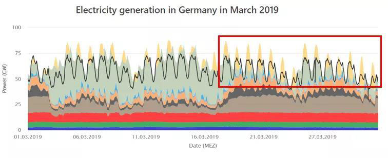 三月太陽(yáng)能發(fā)電量開始逐漸變高,風(fēng)電則開始減少。值得注意的是,三月下旬受新冠疫情的影響,全德經(jīng)濟(jì)活動(dòng)受到一定抑制,總負(fù)荷曲線開始整體下調(diào)。3月22日正午12:30時(shí),在負(fù)荷僅有53.13GW的情況下,僅光伏發(fā)電便達(dá)到了33.41GW,風(fēng)電則為20. 73GW。雖然由于基礎(chǔ)負(fù)荷無(wú)法繼續(xù)向下調(diào)節(jié)容量以消納所有風(fēng)光發(fā)電,因此存在一部分電力出口,但該時(shí)段可再生能源發(fā)電量達(dá)到了總用電消費(fèi)的83.7%。