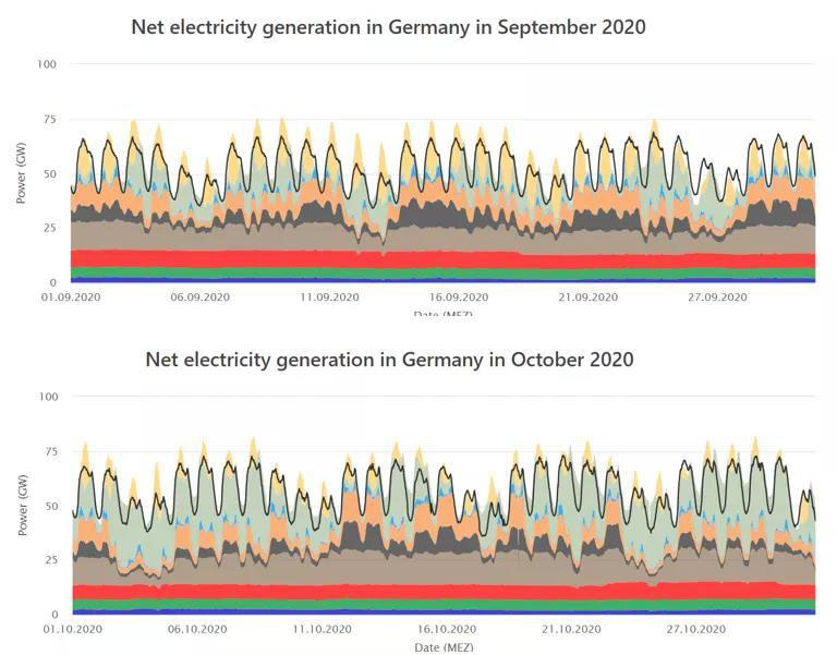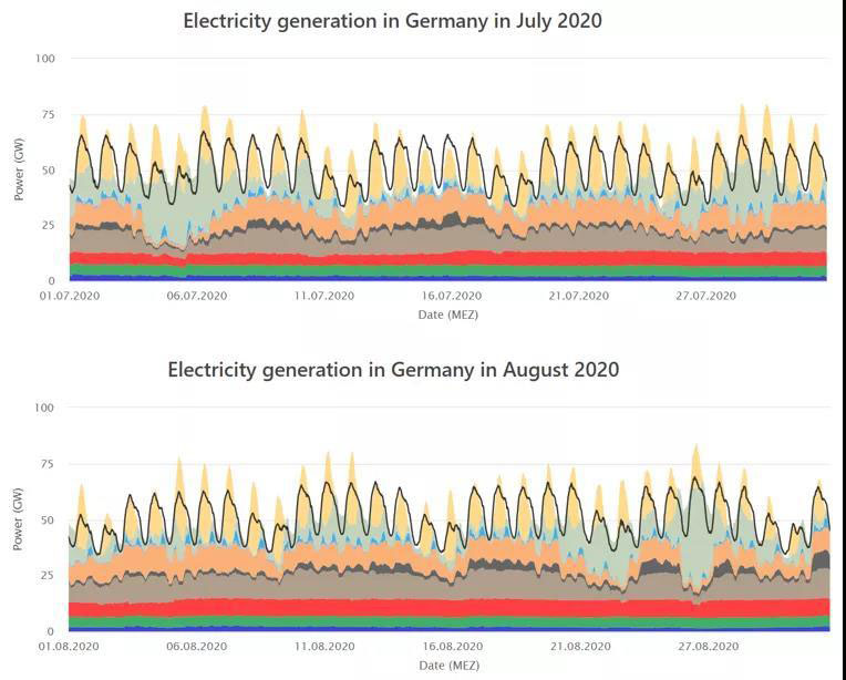 黑色曲線代表一個(gè)月內(nèi)的負(fù)荷曲線,不同顏色的色塊代表不同的發(fā)電源,由上至下:淺黃色為太陽(yáng)能發(fā)電,淺綠色為海上風(fēng)電與陸上風(fēng)電之和,淺藍(lán)色則為抽水蓄能。接下來(lái),橘黃色色塊為天然氣發(fā)電量,深、淺兩種棕色色塊則代表無(wú)煙煤與褐煤發(fā)電量之和。最底部構(gòu)成基礎(chǔ)負(fù)荷的則分別為核能(紅色),生物質(zhì)能(深綠色),及水力發(fā)電(深藍(lán)色)。下同。所有負(fù)荷曲線圖均來(lái)自Fraunhofer ISE研究所的Energy-Charts平臺(tái)。