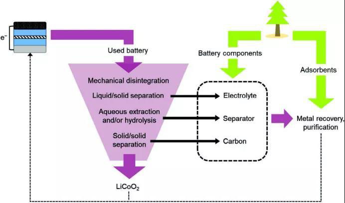 一種選擇性回收金屬離子的替代方法是基于固相萃取,即從電池浸出溶液中將金屬離子吸附在吸附劑材料上而不會(huì)沉淀。吸附劑充當(dāng)金屬離子捕獲劑,可以將金屬離子可逆地結(jié)合到其表面。通過(guò)應(yīng)用帶有接枝官能團(tuán)的多孔吸附劑來(lái)實(shí)現(xiàn)鈷離子捕獲的高選擇性,該方法已被證明可回收鈷離子(圖7)。Co2+離子捕集系統(tǒng)是通過(guò)與合成的螯合劑選擇性結(jié)合來(lái)實(shí)現(xiàn)的。在Li+、Ni2+、Cu2+、Al3+、Mn2+、Fe3+、Ca2+、K+等競(jìng)爭(zhēng)離子存在下,吸附Co2+的選擇性約為90%。吸附劑的穩(wěn)定性和功能性可以維持20次以上的循環(huán)。最近,應(yīng)用離子液體被證明是從廢舊正極中回收過(guò)渡金屬的另一種有前途的方法。此外,盡管在回收過(guò)程中施加高溫不是可持續(xù)性的優(yōu)先方法,但在某些情況下,只有在室溫以上才能獲得潛在的好處。例如,可以在900℃下通過(guò)與Li2CO3進(jìn)行固相反應(yīng)來(lái)重新活化來(lái)自正極的用過(guò)的LiCoO2粉末,并重新用于新的LIBs中。