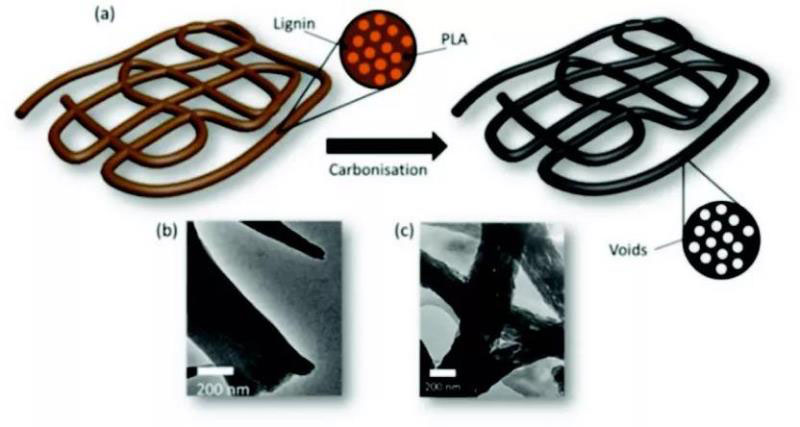 由于芳香族植物聚合物木質(zhì)素相對(duì)較高的碳含量≈60%,近年來(lái)木質(zhì)素衍生含碳材料的生產(chǎn)受到了極大的關(guān)注。木質(zhì)素衍生的碳纖維薄膜已經(jīng)被證明是多孔材料,能夠生產(chǎn)無(wú)粘合劑的鋰離子電池。最近顯示,木質(zhì)素與聚乳酸(PLA)混合的靜電紡絲可生產(chǎn)復(fù)合纖維,作為多孔碳納米纖維的前體。碳化過(guò)程中,PLA的熱分解有助于形成碳納米纖維的多孔形態(tài)(圖11)。隨后在LIBs中使用多孔納米纖維作為電極,在500次充放電循環(huán)后,容量值為611 mAh g?1,比容量沒(méi)有明顯損失。